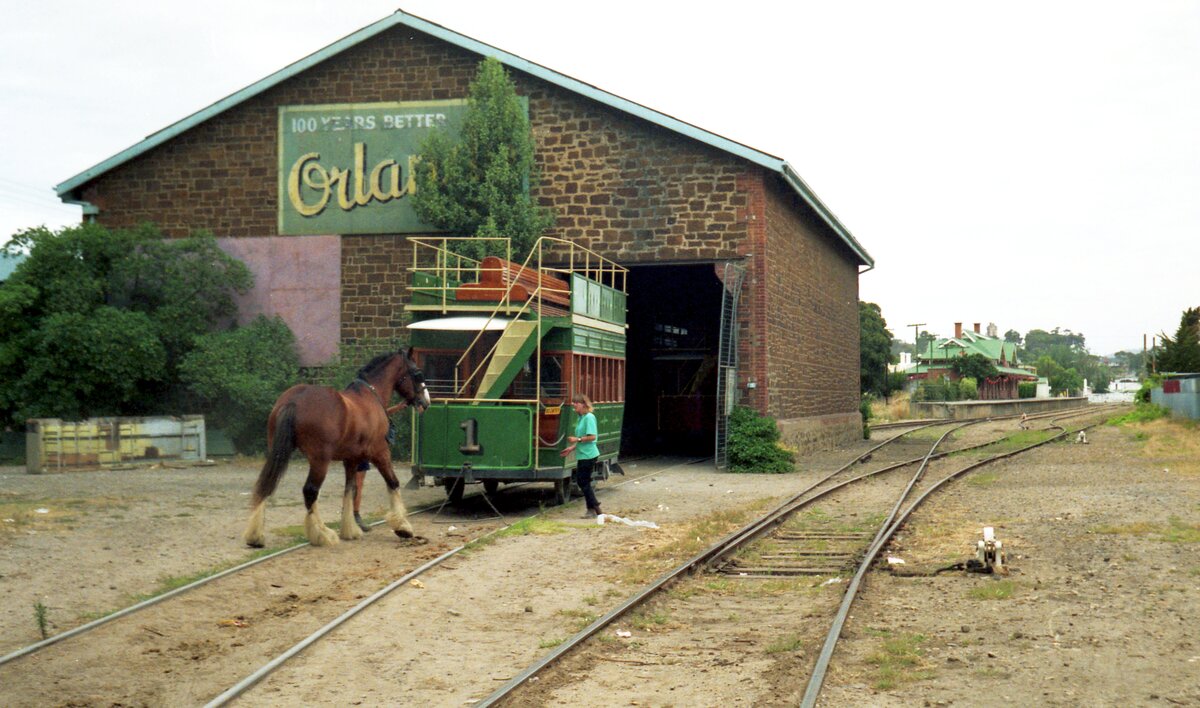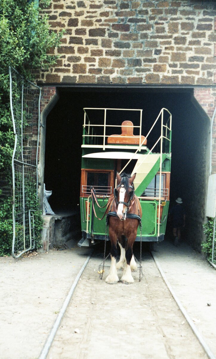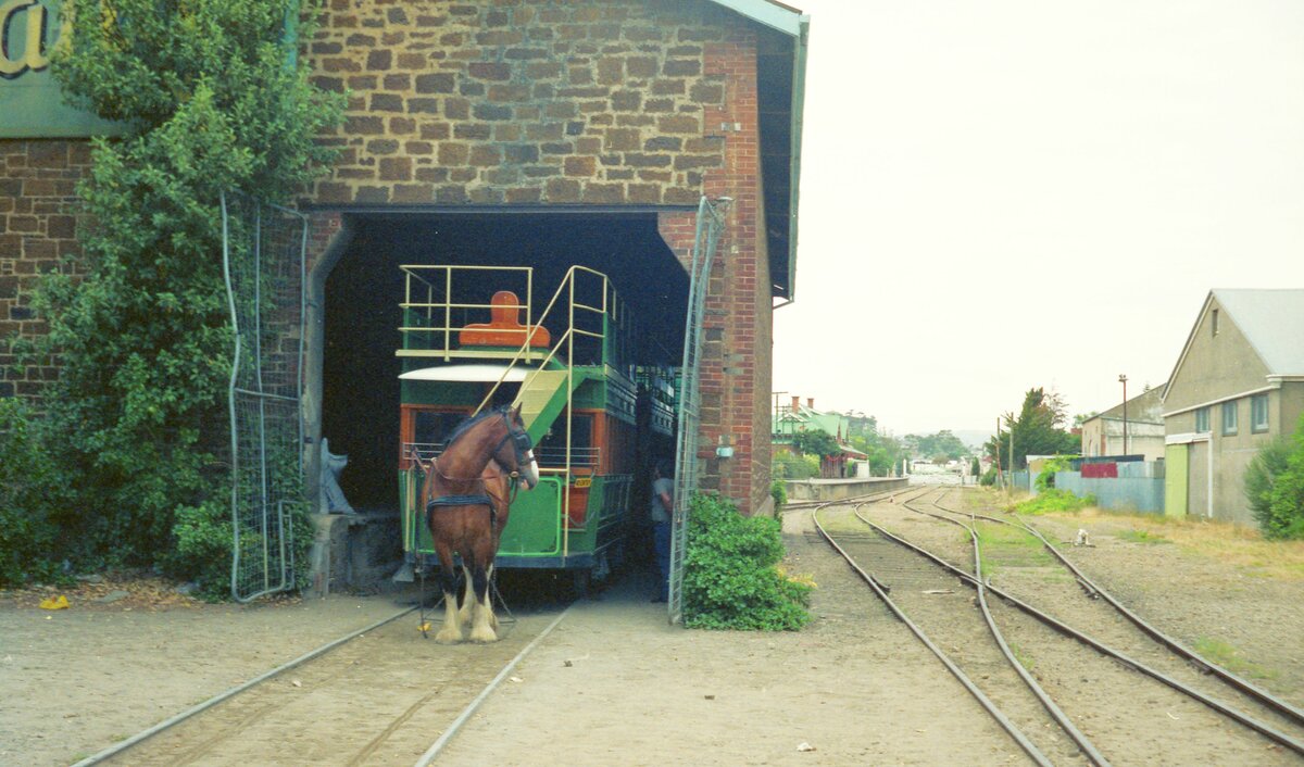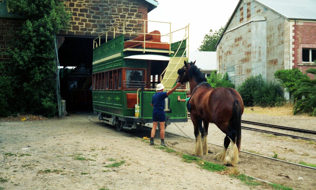 Eine 630 m lange hölzerne Seebrücke verbindet Granite Island mit Victor Harbor. Über sie führt auch die Pferdestraßenbahn Victor Harbor. Hier ist Wagen 1 an der Ausweichstelle zu sehen. (08.01.2020)