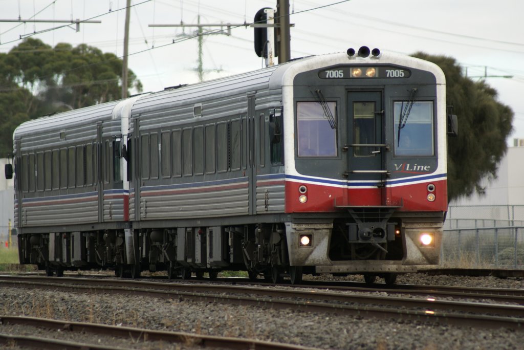 7025 der V-Line unterwegs von Morewell Richtung Moe, im Hintergrund die 4 Blöcke der 1600MW Hazelwood Power Station, La Trobe Valley, April 2002