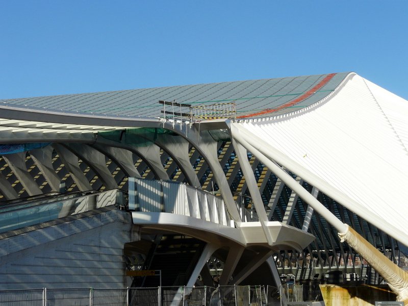 Auf diesem Bild sieht man einen Teil des Daches des Bahnhofes von Liège Guillemins mit den filigran anmutenden Stützpfeilern, welche der ganzen Konstruktion eine gewisse Leichtigkeit verleihen. 17.02.08