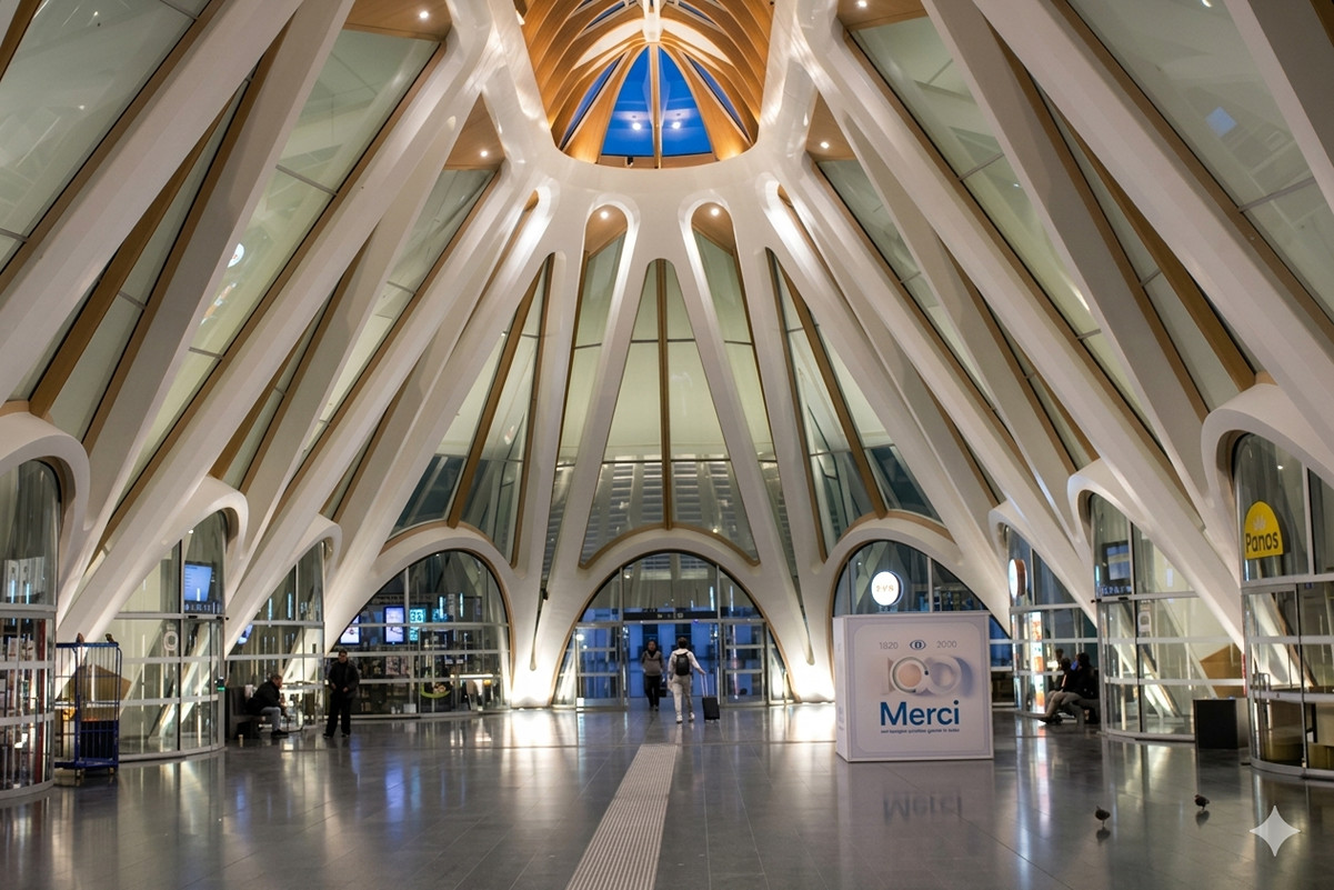 "Eine Kathedrale der Mobilität" bezeichnet der Architekt den neuen Bahnhof in Mons. Die Bahnhofshalle deutet jedenfalls darauf hin; 06.04.2026.