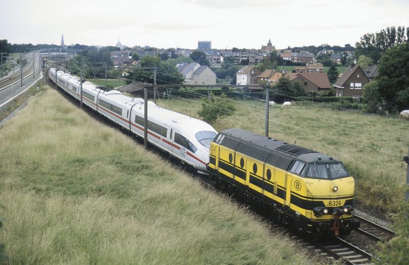 HLD 6324 (Baureihe 6201-6333) schleppt eine ausgefallen ICE3M (BR 406) zurück nach Aachen Hbf. Ausfahrt der Bahnof Leuven am 22/06/2004.