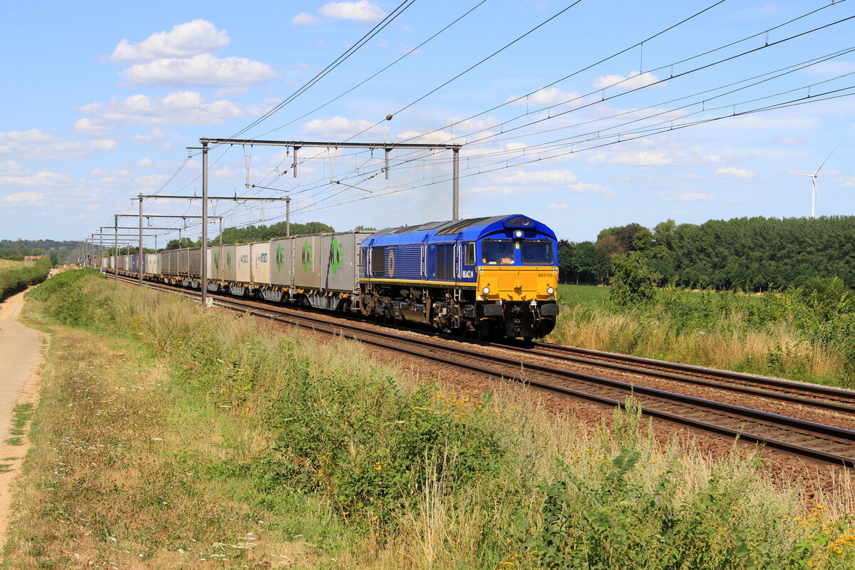 NMBS 7760 + 7750 mit einem langen Containerzug aus Athus zum Rangierbahnhof Stockem, bei der Ankunft in Stockem am 11.09.2009, 16.19u. Scanbild 17508, Fuji S200.