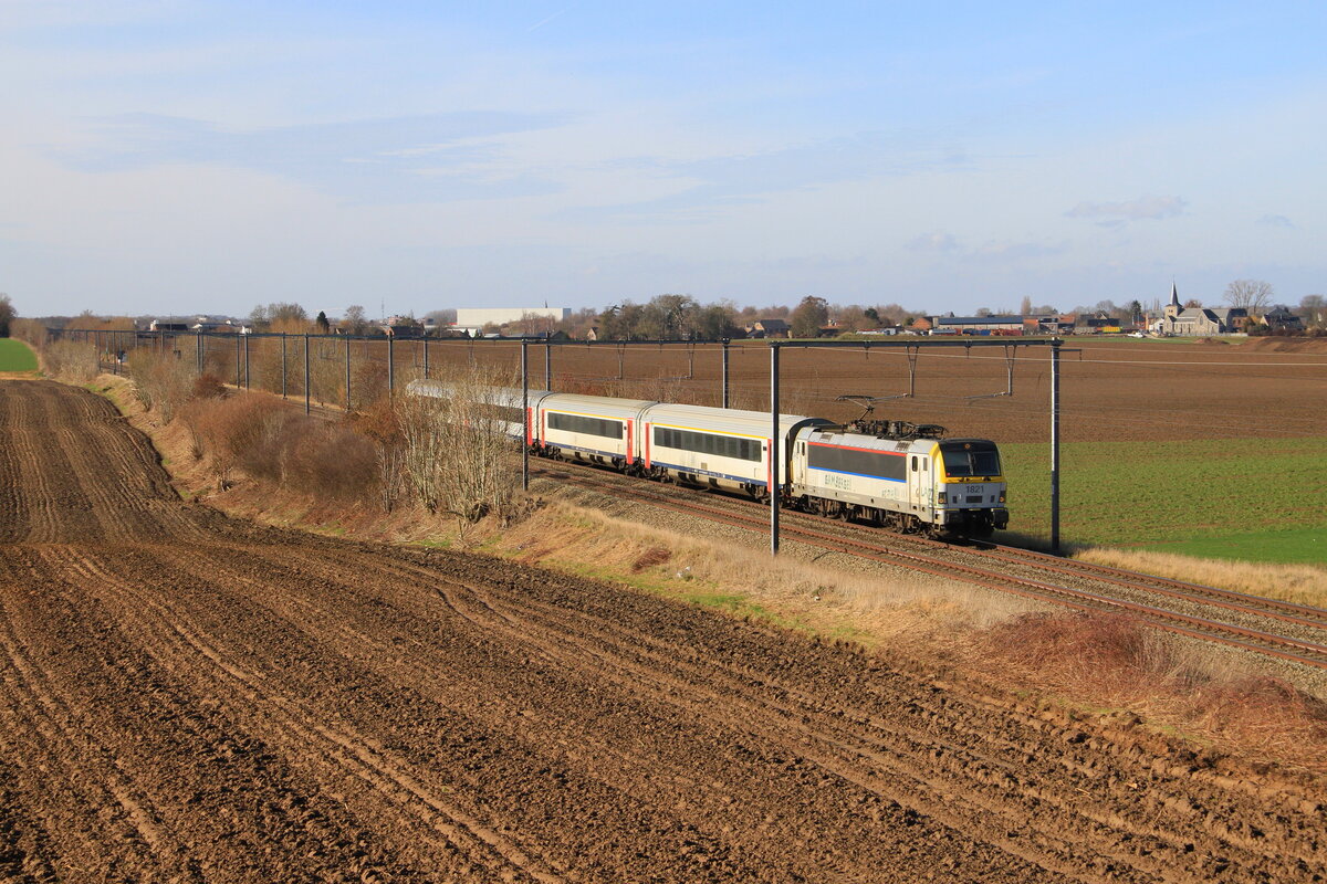 Belgiën Lok 1821 vom SNCB zieht einem leerem Personenzug nach Kinkempois, in Pousset 18/2/2026