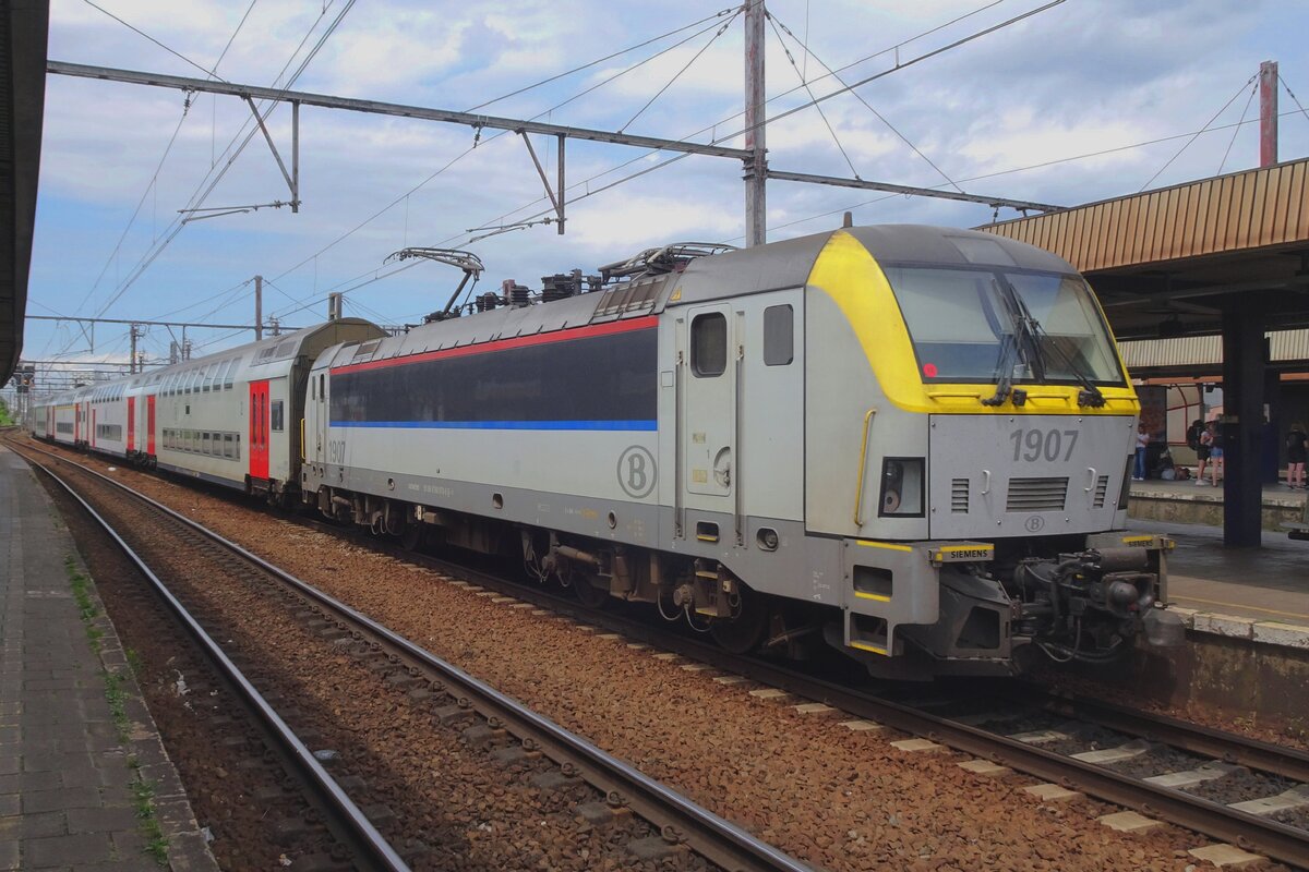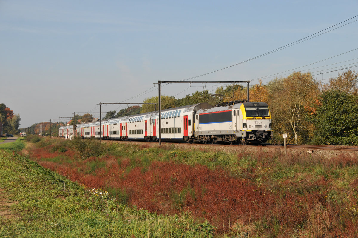 SNCB-Lok 1907 schiebt den IC2234 Tongeren - Gent-Sint-Pieters dem nächsten Halt in Diest entgegen. Die Aufnahme entstand am 18/10/2017 in Lummen.