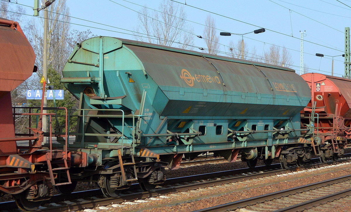 Drehgestell-Schüttgutwagen mit Schwenkdach und dosierbarer Schwerkraftentladung vom Einsteller ERMEWA mit belgischer Registrierung mit der Nr. 33 RIV 88 B-ERMW 0820 547-4 Tads in der Vergangenheit wohl mal von LOVOCHEMIE a.s. angemietet am 24.02.21 in einem Ganzzug im Bf. Flughafen BER Terminal 5. Lothar Stöckmann