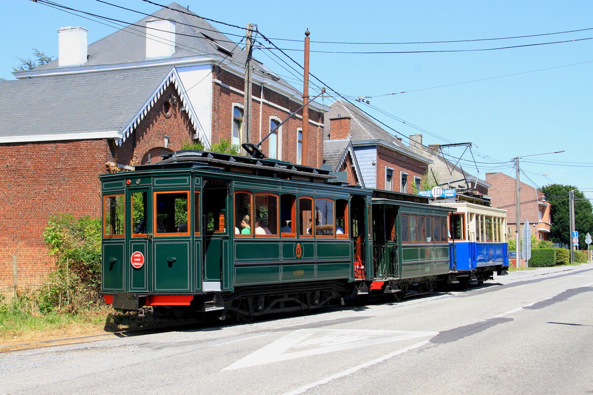 Preserved trams A9288 + trailer A1936 and A9515 from ASVi, waiting for departure at Lobbes, during the Tram Festival 2025, 18/8/2025