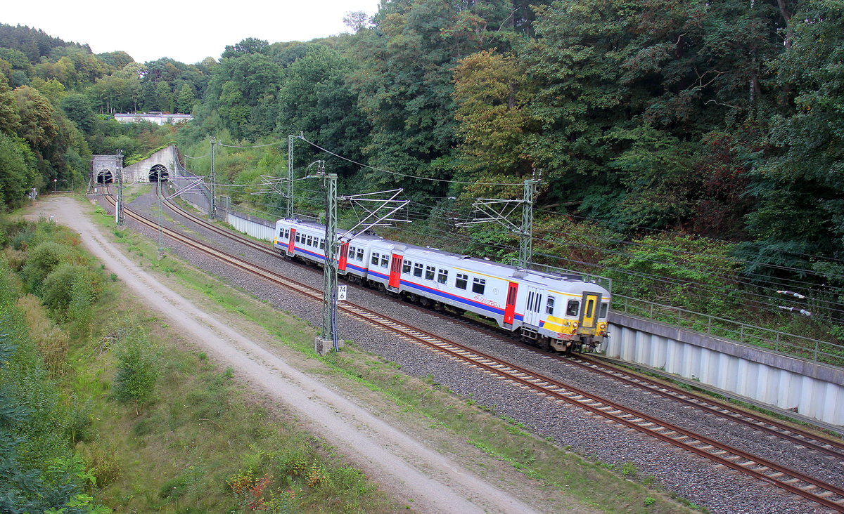 Ein Triebzug der SNCB 656 kommt aus Aachen-Hbf nach Spa-Géronstère(B) und kamm gerade aus dem Aachener-Buschtunnel aus Richtung Aachen-Hbf und fährt in Richtung Hergenrath(B). Aufgenommen von einer Fußgängerbrückein Preusswald bei Aachen.