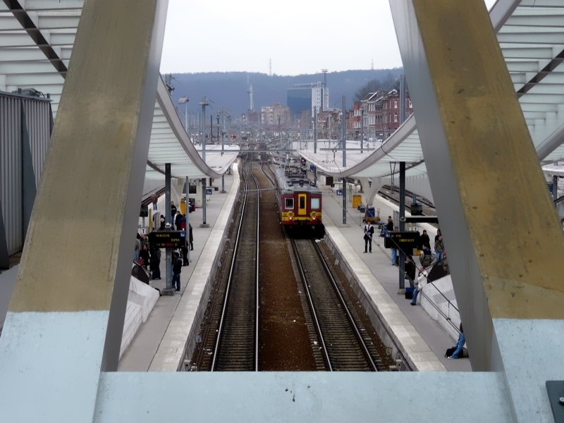 Ein Triebzug verlässt den Bahnhof Liège Guillemins in Richtung Abstellplatz am 07.03.08. Das Bild wurde von der Fußgängerbrücke über den Bahnsteigen gemacht.