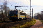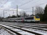 SNCB-Triebwagen 424 der Serie AM 80 (Break) passiert soeben den letzten beschrankten BÜ am Ortsausgang von Hoeselt. Aufgenommen am 20/02/2010.