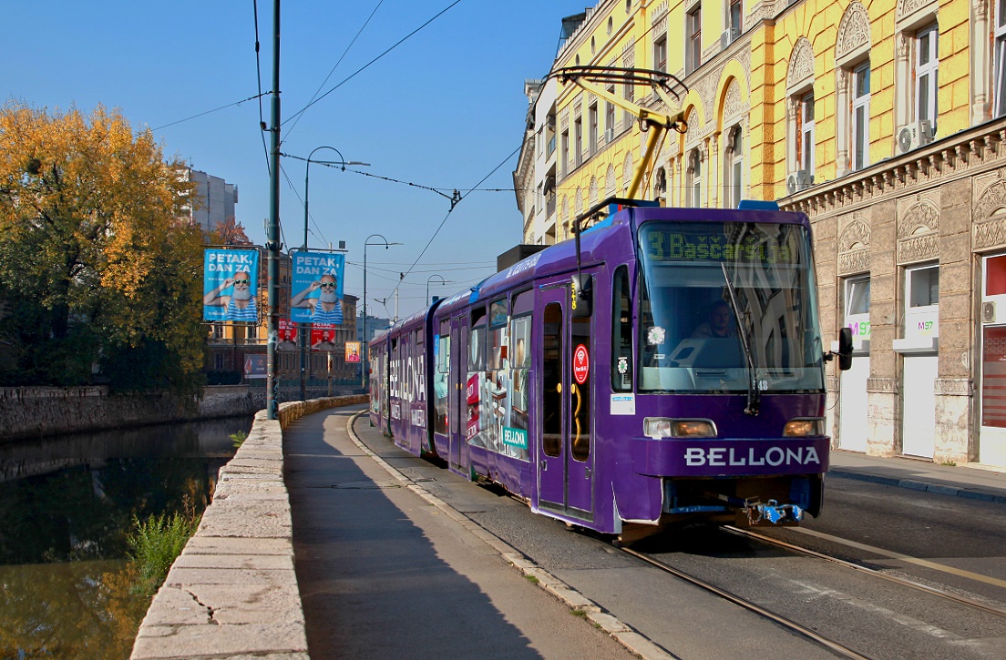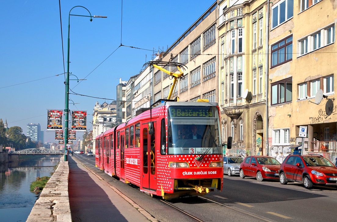 Bei dem Tw 601 der Straßenbahn Sarajevo handelt es sich um einen Achtachser des Typs Satra III, der aus einem K2YU unter Zufügung eines Niederflur-Mittelteils umgebaut wurde (Sommer 2005)