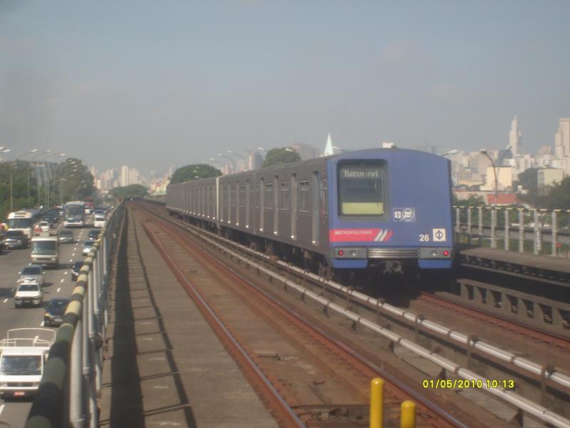 Trem unidade elétrico da CMSP na linha 3 - Vermelha, chegando na estação Bresser-Mooca, em São Paulo. Fabricado 25 deles todos no Brasil entre 1984 e 1986 pela COBRASMA.