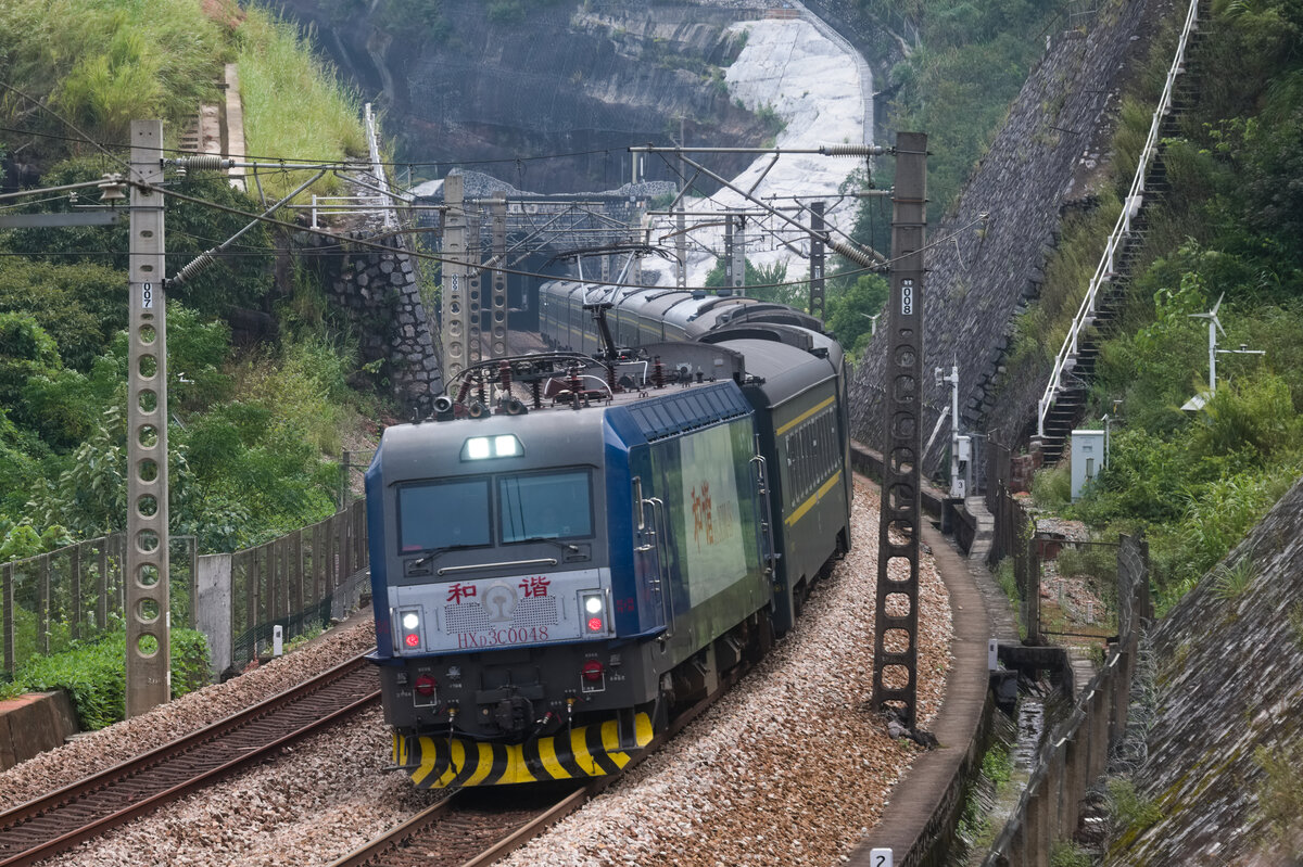 2025.09.21, HXD3C 0048 von CR GuangZhou (Depot ChangSha), südlich des Bahnhofs BaiShiDu in der Provinz HuNan. 0048 erschien zusammen mit einem anderen „Schnellzug”, der angesichts der weit verbreiteten Hochgeschwindigkeitszüge als langsam galt. KCRC Railway