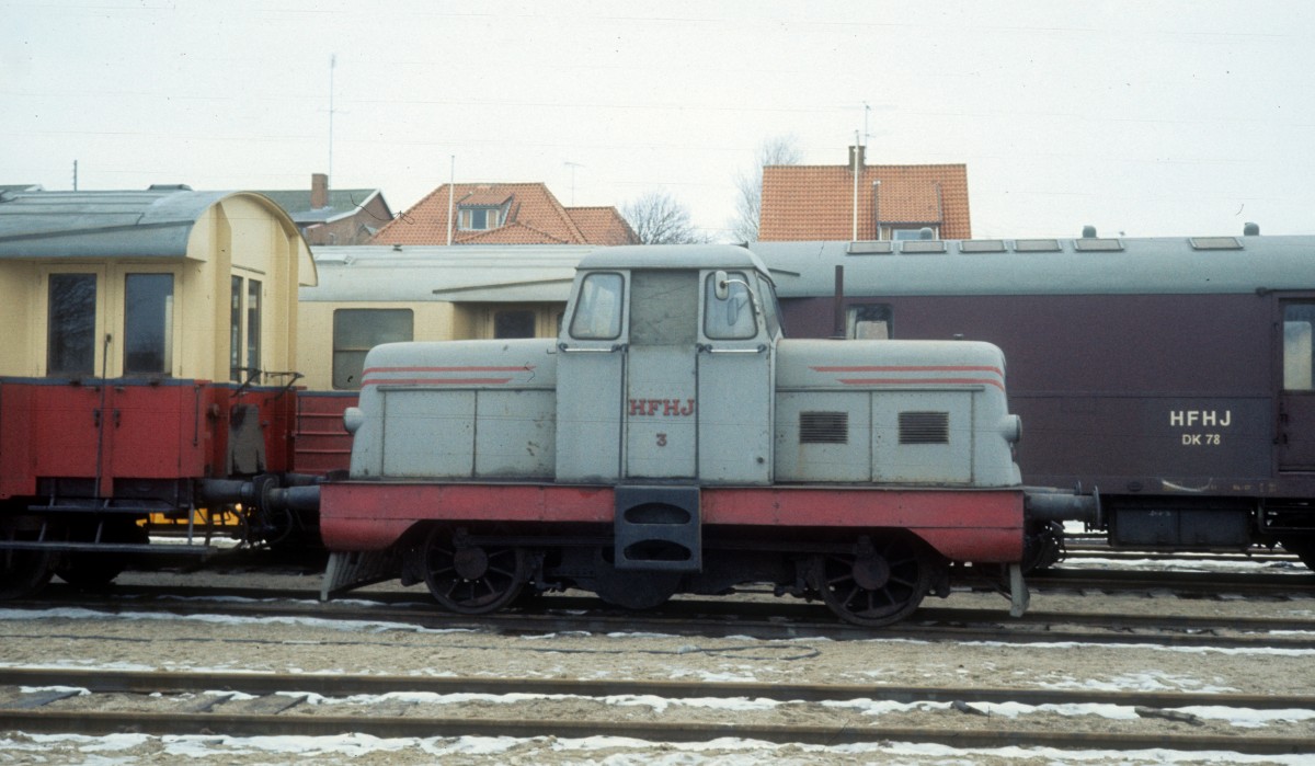 HFHJ (Hillerød-Frederiksværk-Hundested-Jernbane, auch Frederiksværkbanen genannt): Abgestellt in Hundested stehen am 23. Dezember 1976 u.a. die Diesellok T 3 und ein paar Personenwagen. - Die Lok wurde 1989 an die Museumsbahn Maribo-Bandholm-Jernbane verkauft.