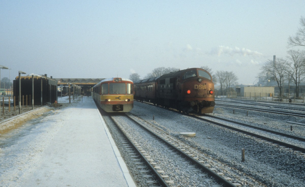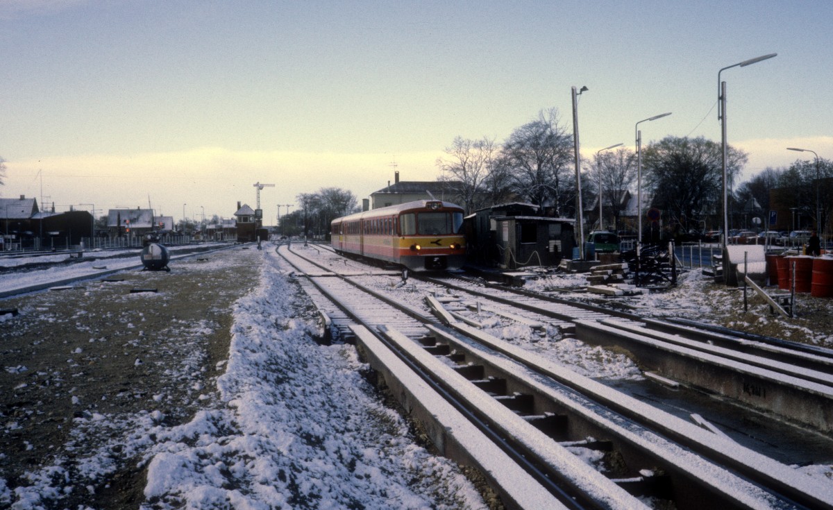 Østbanen Triebzug (Ym+Ys+Ym+Ys) / DSB Regionalzug (Mx 1012 + Nahverkehrswagen) Bahnhof Køge am 26. Februar 1983. - Der Umbau des Bahnhofs war zu der Zeit in vollem Gang.