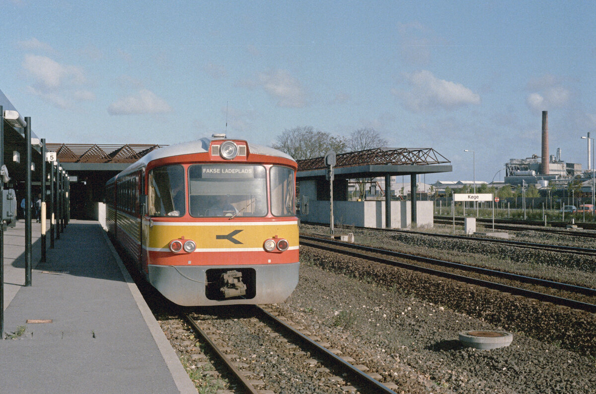 Østsjællandske Jernbaneselskab (ØSJS, Østbanen) im Oktober 1985: Der Zug nach Fakse Ladeplads steht am Bahnsteig / Gleis 5 im Bahnhof Køge fahrbereit; die Garnitur besteht aus einem Triebwagen (Ym) und einem Steuerwagen (Ys). - Scan eines Farbnegativs. Film: Kodak CL 200 5093. Kamera: Minolta XG-1.