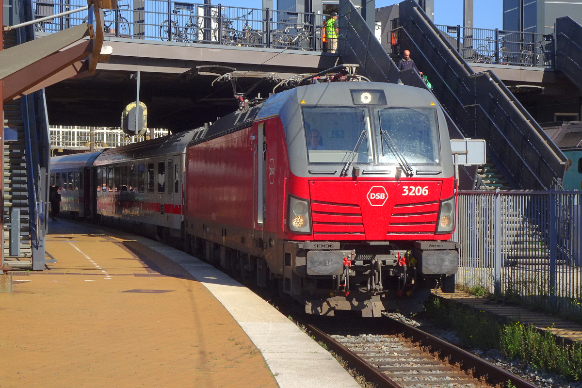 Vectron 3206 der DSB brachte am Dienstag, 5. September 2023, den IC 395 von Kopenhagen nach Hamburg. Der Zug war ziemlich voll: von den 7 Waggons - gestellt von der DB - funktionierte bei 2 die Klimaanlage nicht und sie waren für Reisende abgesperrt. Später habe ich gelesen, der Grund dafür sei in den etwa 20 Phasentrennstellen zu suchen, die mit geöffnetem Hauptschalter passiert werden müssen. Das anschließende Wiedereinschalten macht den bald 40 Jahre alten Klimaanlagen Probleme. Hoffentlich bringen die neuen Züge von Talgo eine Verbesserung! Kopenhagen H, 05.09.2023