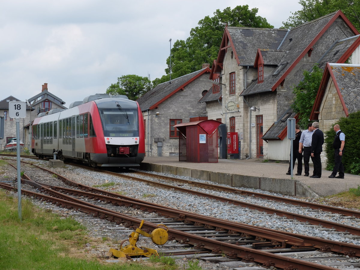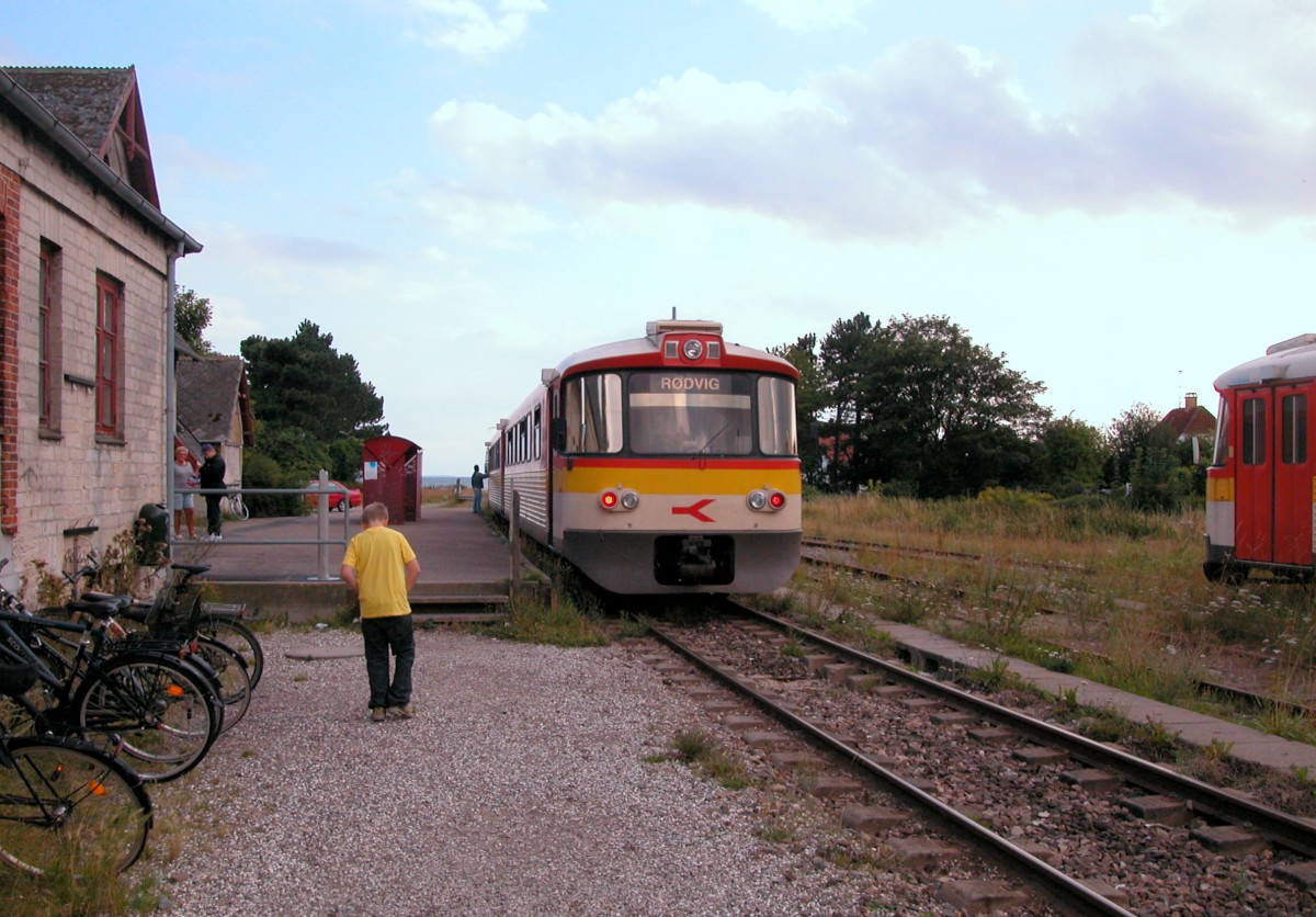 Østbanen: Bahnhof Rødvig am 23. Dezember 1975. - Ein Triebzug bestehend aus einem Ym und einem Ys hält am Bahnsteig, während ein Triebwagen (MB, in Schweden gebaut) abgestellt ist.
