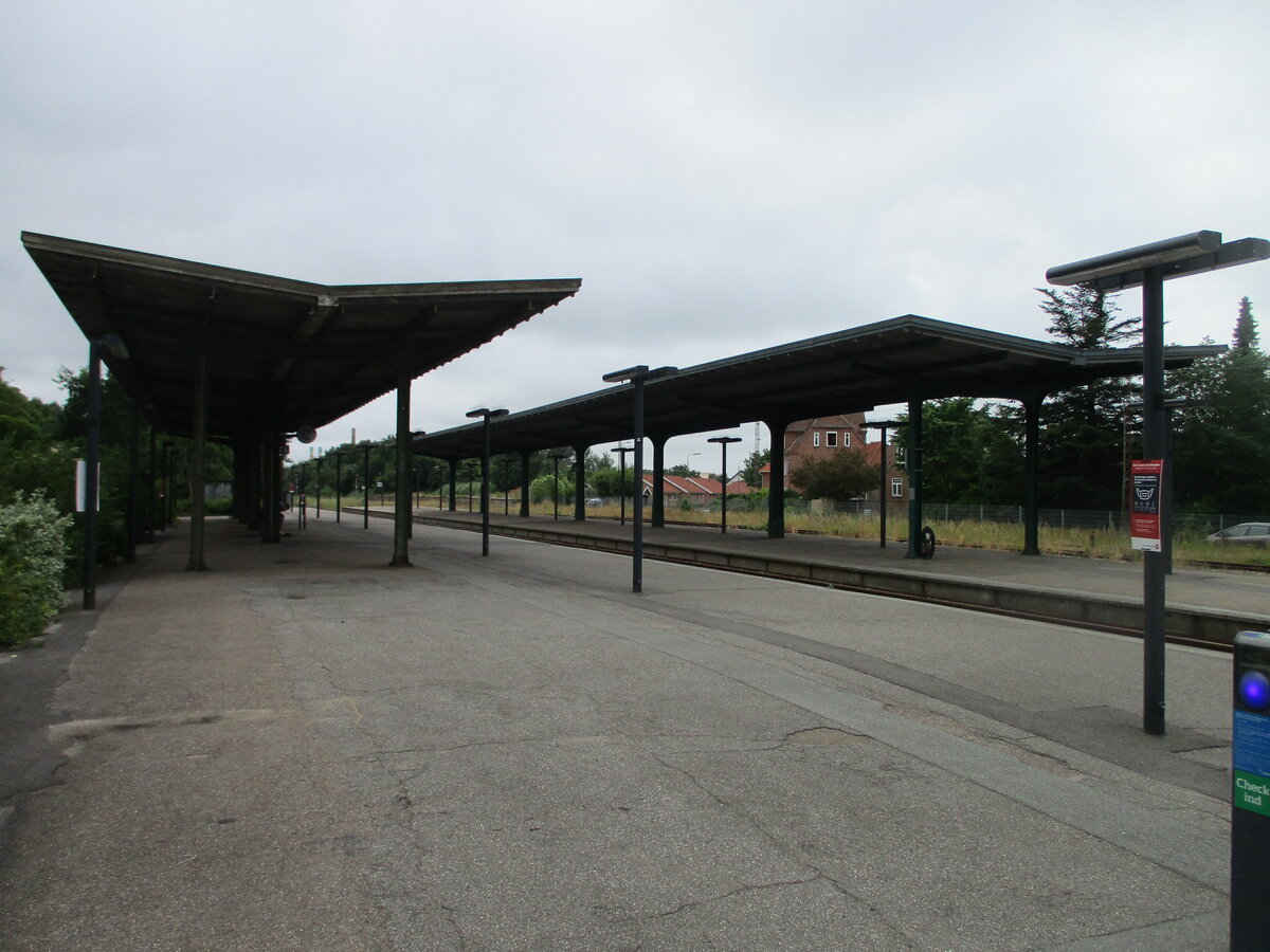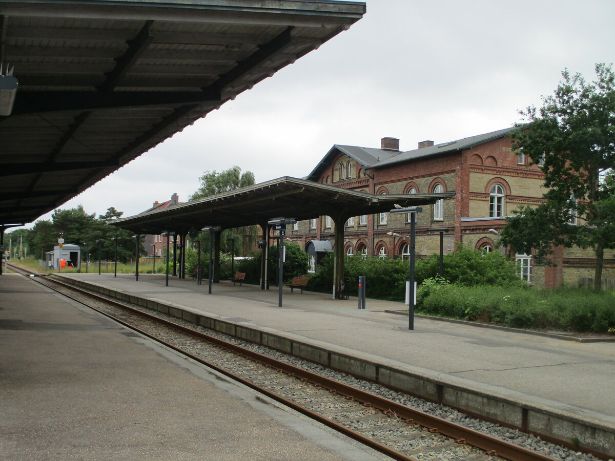 Das im Vordergrund liegende Gleis war einst das Ladegleis in Tonder und ist Heute ohne Verbindung zum Hauptgleis.Aufgenommen am 23.Juni 2021.