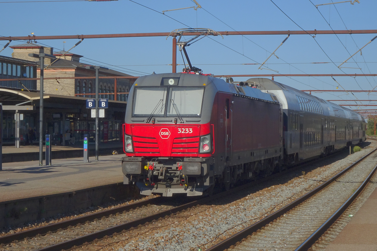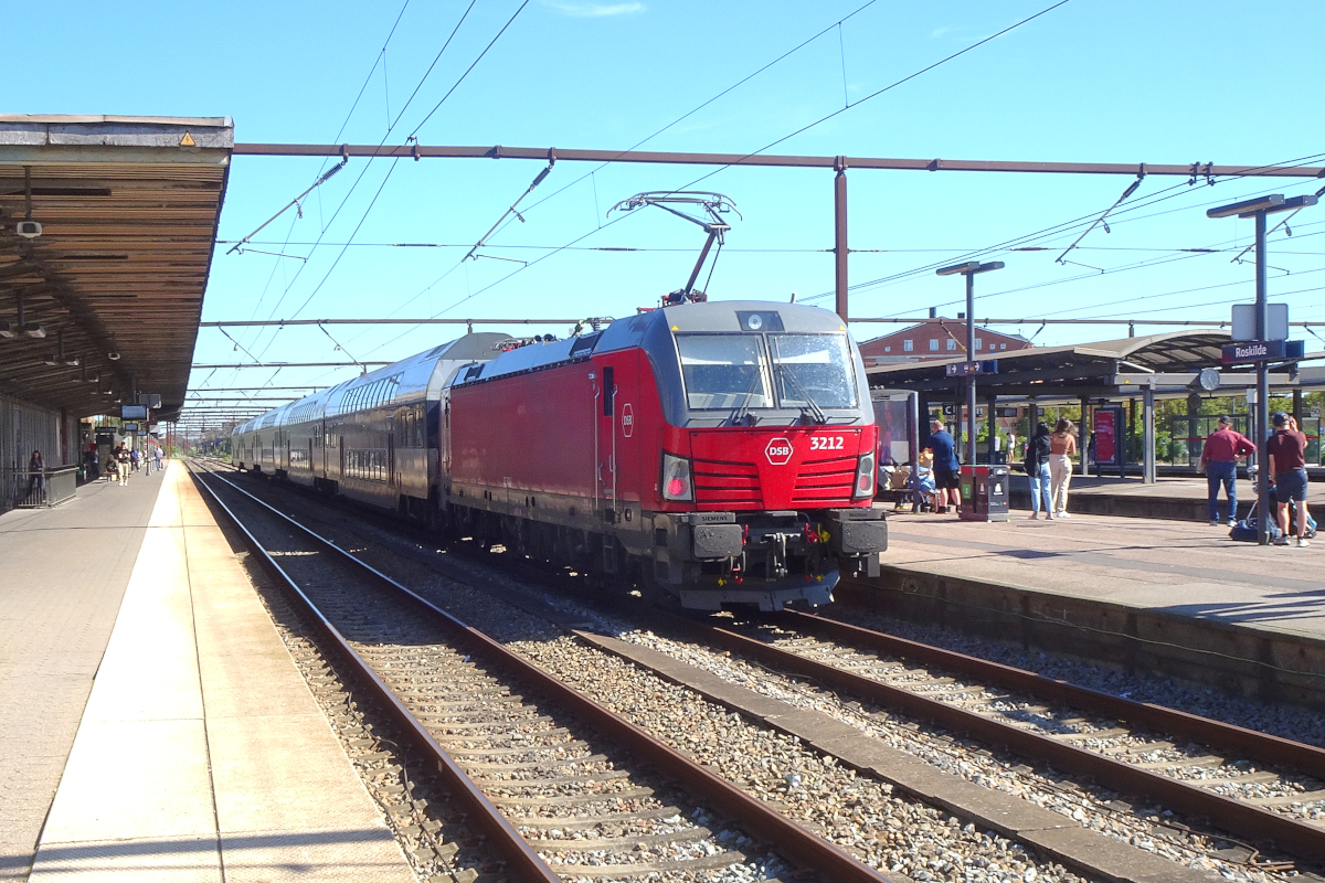 Dieses Foto zeigt einen Regionalzug Roskilde - Helsingør auf Gleis 2 des Bahnhofs Roskilde. Werktags besteht auf dieser Strecke durch Kopenhagen mindestens ein Halbstundentakt. Hier schiebt Vectron EB 3212 der DSB 5 Doppelstock-Waggons des Herstellers Bombardier.