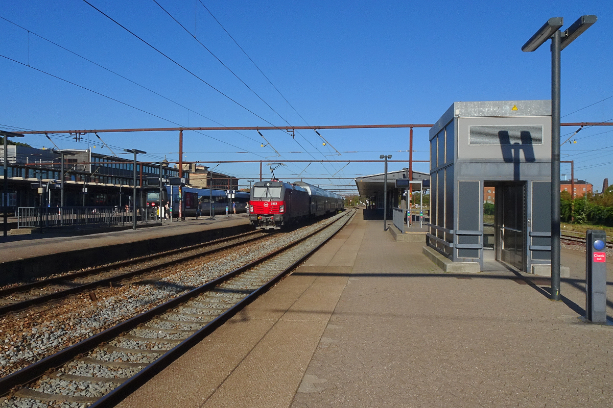Einen Überblick über den abendlichen Bahnhof Roskilde bietet diese Aufnahme. Auf Gleis 5 steht Vectron EB 3233 der DSB mit einem Doppelstockzug bereit zur Fahrt nach Helsingør über Kopenhagen, daneben auf Gleis 4 wartet ein Diesel-IC der Reihe MFA-MFB auf die Abfahrt nach Kopenhagen. Der vor den Zügen liegende Abschnitt nach Hoje Tastrup ist viergleisig.