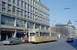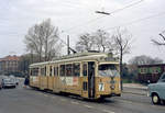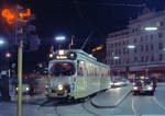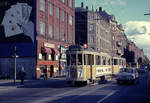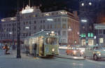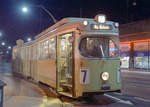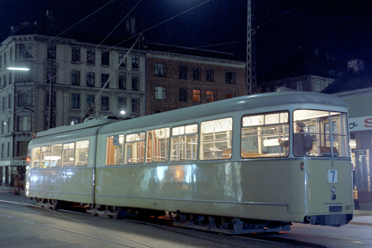 København / Kopenhagen Københavns Sporveje: Der letzte Zug der SL 7 (DÜWAG/Kiepe-GT6 867) hält in der Nørrebrogade, bereit, in den Betriebsbahnhof Nørrebro hineinzufahren. Datum: 25. April 1971, kurz nach Mitternacht. - Nach der Umstellung der SL 7 auf Dieselbusbetrieb gab es nur noch eine Straßenbahnlinie in Kopenhagen, die Linie 5. - Scan eines Farbnegativs. Film: Kodak Kodacolor X.