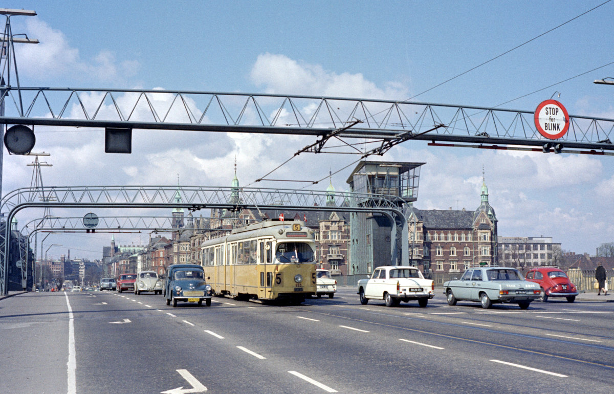 København / Kopenhagen Københavns Sporveje SL 5 (DÜWAG/Kiepe-GT6 889) Langebro am 22. April 1972. - Die Langebro (: Lange Brücke) verbindet den Teil von Kopenhagen, der auf der Insel Sjælland (: Seeland) liegt, mit dem Teil, der sich auf der Insel Amager befindet. - Damals war der Kopenhagener Hafen noch ein sehr aktiver Verkehrshafen mit sowohl Fährschiffen nach Bornholm, Schweden und Norwegen als vielen Frachtschiffen - nur im Kopenhagener Nordhafen gibt es heute noch etwas Verkehr, und zwar die DFDS-Fährschiffverbindung nach Oslo und einen gewissen Frachtschiffsverkehr. - Scan eines Farbnegativs. Film: Kodak Kodacolor X. Kamera: Kodak Retina Automatic II.