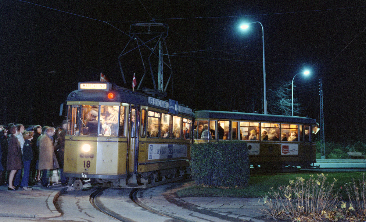 Århus / Aarhus Århus Sporveje (ÅS): Der letzte Zug der SL 1 - und damit die letzte ÅS-Straßenbahn in Betrieb - ist in der Endstation in der Dalgas Avenue angekommen. Nach einigen Minuten wird die Garnitur in den Betriebshof rückwärts einfahren. - Scan eines Farbnegativs. Film: Kodak Kodacolor X. Kamera: Kodak Retina Automatic II.