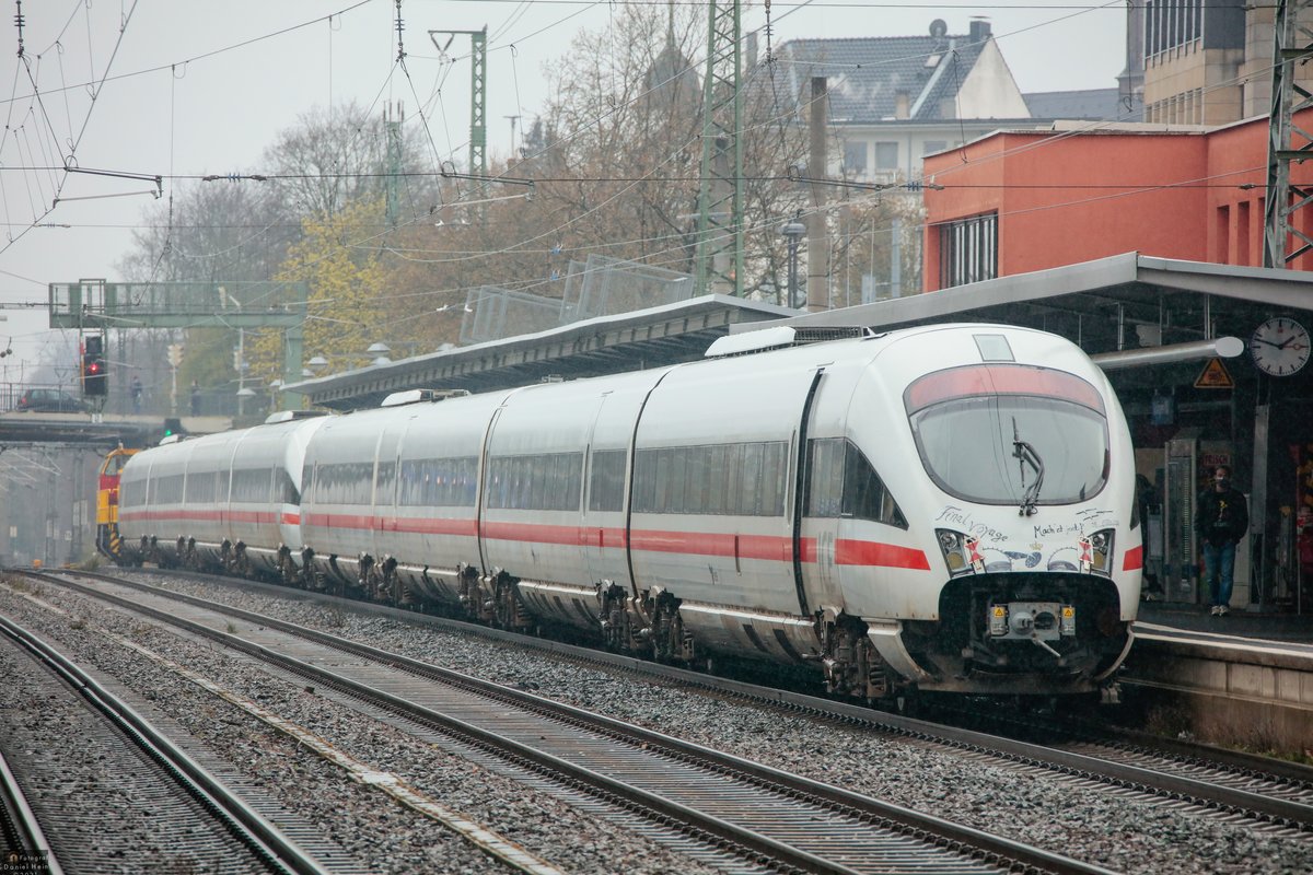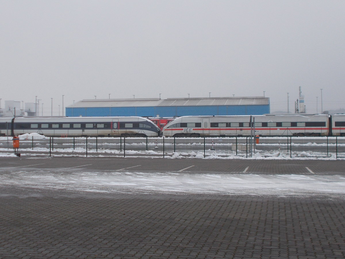 Kaum sind die Tore der Fähre von Puttgarden nach Rödby geöffnet, bahnen sich im Abendlicht gleich mehrere "Ungetüme" den Weg aus dem Bauch der Fähre ins Freie. Links der ICETD der DSB, Hamburg Hbf - Kopenhagen und rechts die LKW´s. Der ICE wird nach kurzem Halt im Fährbahnhof Rödby Faerge den Weg nach Kopenhagen fortsetzen. 11.10.2012