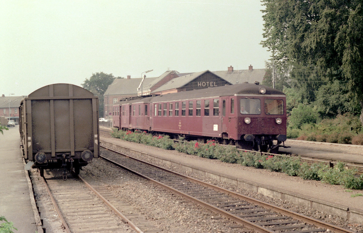 DSB-Kleinstadtbahnhöfe: Bahnhof Ulfborg am 21. November 1981. - Personenzug nach Struer. Der Zug besteht aus einem Triebwagen der Baureihe Mo und einem Steuerwagen des Typs Bhs. - Heute fahren hier moderne Triebzüge (LINT 41) des Unternehmens Arriva.