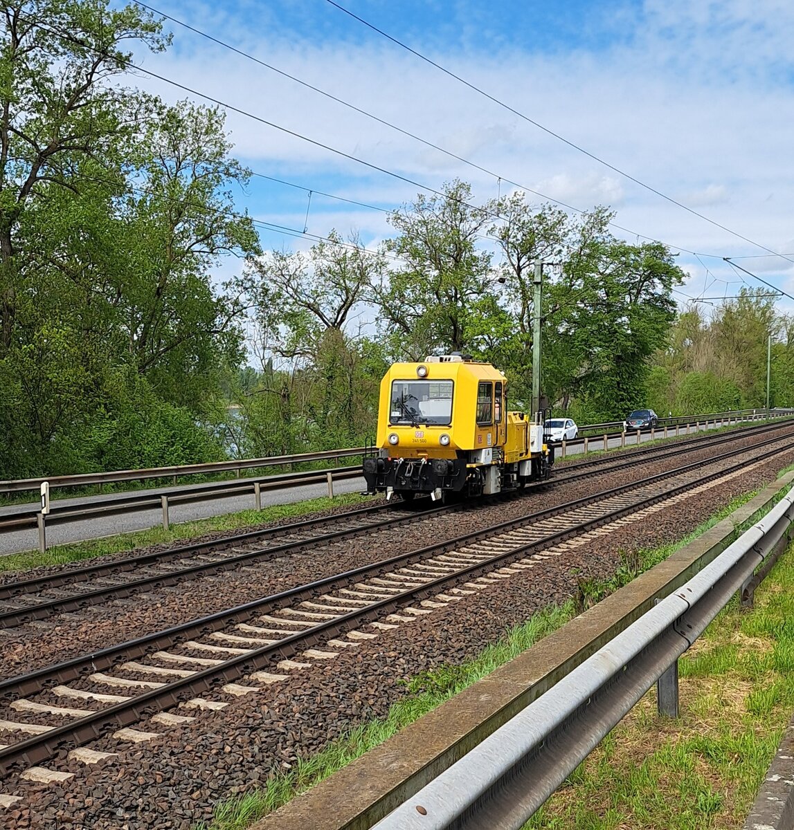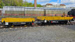 Ein Gleisarbeitsfahrzeug plus Anhänger der DB Netzinstandhaltung wartete Anfang Juni 2024 in Husum auf den nächsten Arbeitseinsatz.