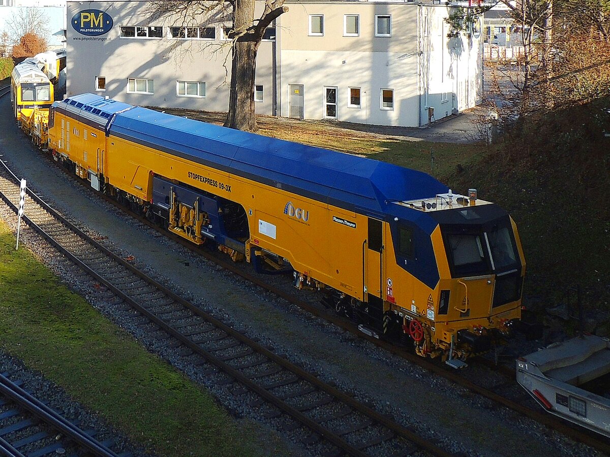 DB Bahnbau Gruppe Gleistopfmaschine P&T STOPFEXPRESS 09-3X "GSM 342" (D-DB 99 80 9121 009-1) und einer Schotterplaniermaschine | Anklam | Dezember 2020