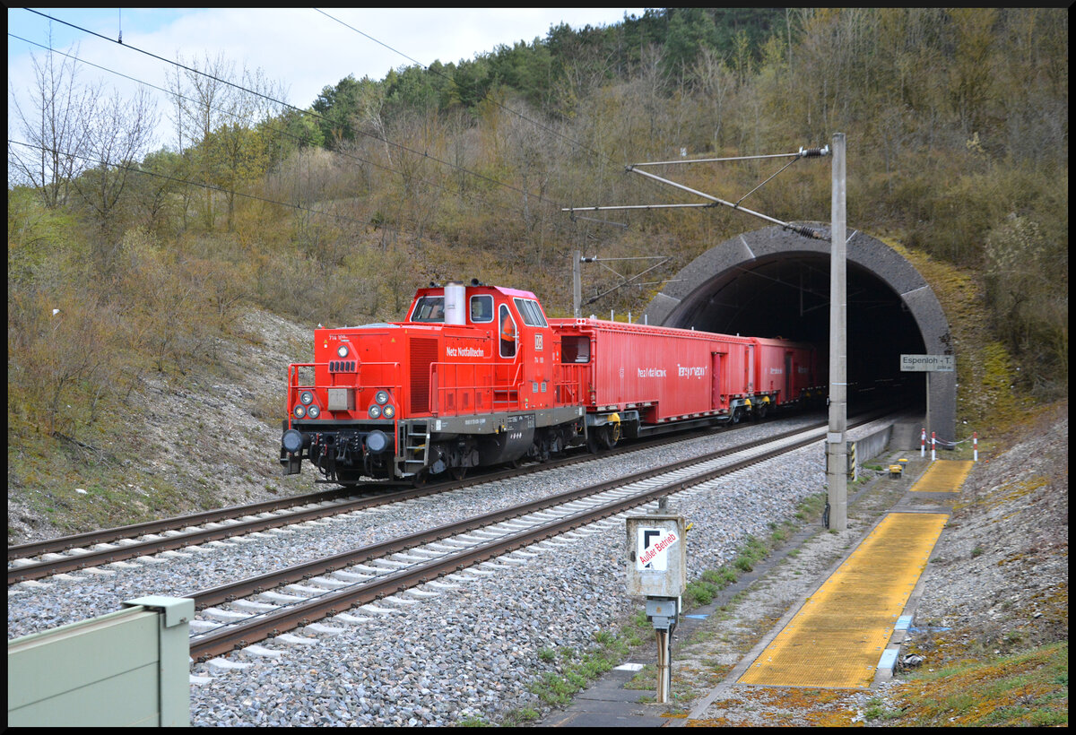 Der Würzburger Tunnelrettungszug (TRZ) am 08.03.2026 bei seiner wöchentlichen Bewegungsfahrt nach Lohr Bahnhof. Standardmäßig sind zwei Lokomotiven der Baureihe 714 an diesem Spezialzug. Die Lok 714 109 (NVR: 9980 9 170 009-1 D-DBMP) führt den Zug bei Leinach aus dem 2.235 Meter langen Espenloh-Tunnel (SFS Hannover - Würzburg), während ihre Schwester 714 107 (NVR: 9980 9 170 007-5 D-DBMP) am anderen Ende nachschiebt. Matthias Kümmel