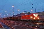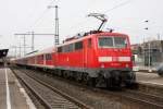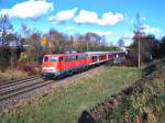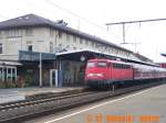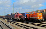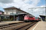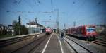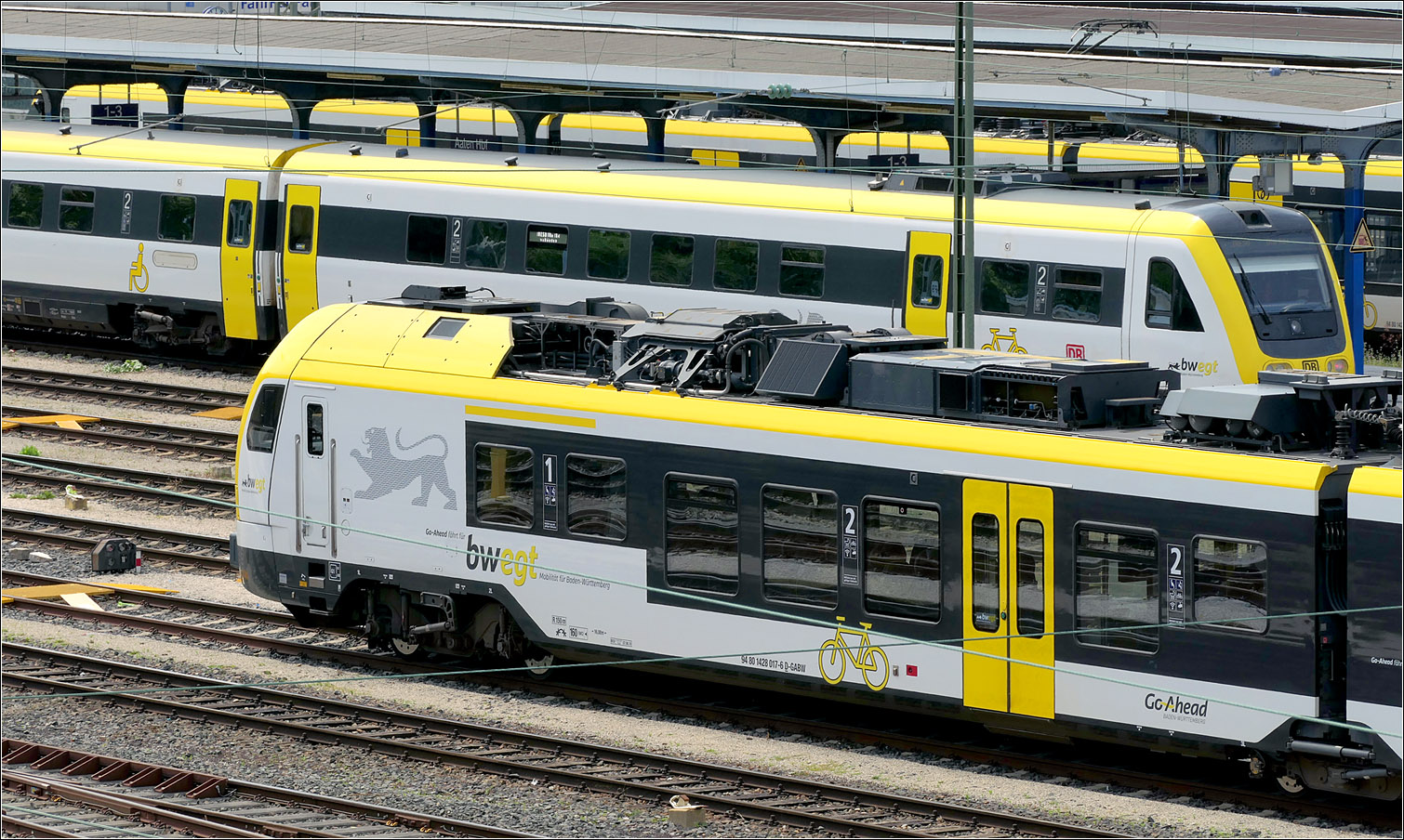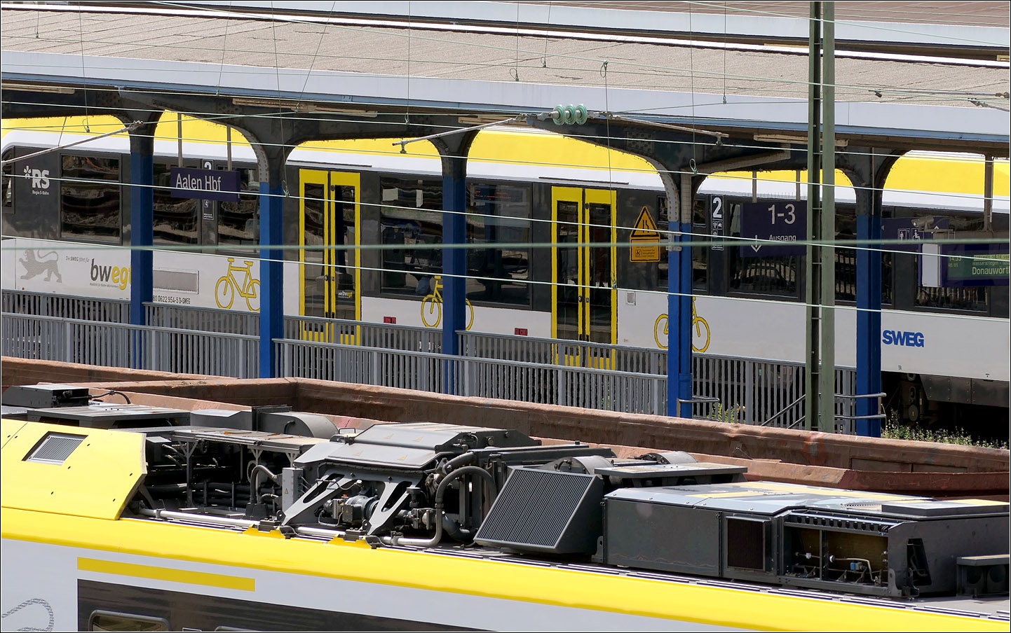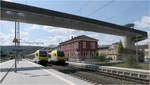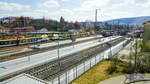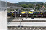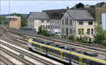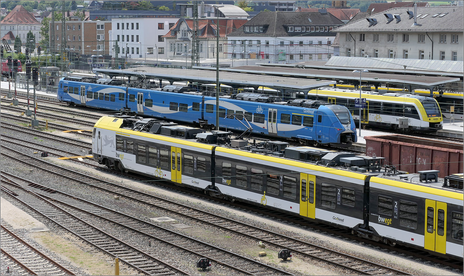 Blick über die Dachaufbauten eines abgestellten Flirt-3-Triebzuges neben Güterwagen zum Bahnsteiggleis 2 mit einem abfahrtsbereiten VT 622 der SWEG nach Ulm.