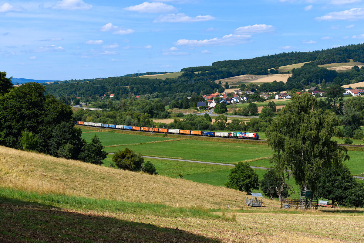 An Samstagen kommt gerne ein Ganzzug von BELog durch das Haunetal in Richtung Süden gefahren. Am 19. Juli 2025 beförderte die 159 260 die bunten Waggons der Gattung Eamnos, welche mit Sand beladen waren. Die Lok trägt eine Werbung für "Rail-Flow", eine digitale Plattform für den Schienengüter- und Intermodalverkehr. Das Ziel des Zuges variiert, an diesem Tage ging es wohl nach Mergelstetten. Christoph Schneider