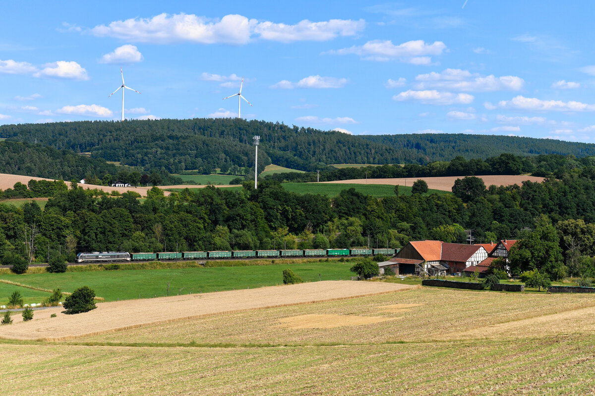 Die für die Starkenberger Gruppe fahrende 159 211 war am Nachmittag des 19. Juli 2025 mit einer Ladung Aushub im osthessischen Haunetal in Richtung Ostdeutschland unterwegs. Bei Hermannspiegel lag der Zug halbwegs gut im Licht. Einst ein idyllisches Motiv, jedoch künden Windräder und 5G Sendemast von der Neuzeit. Christoph Schneider