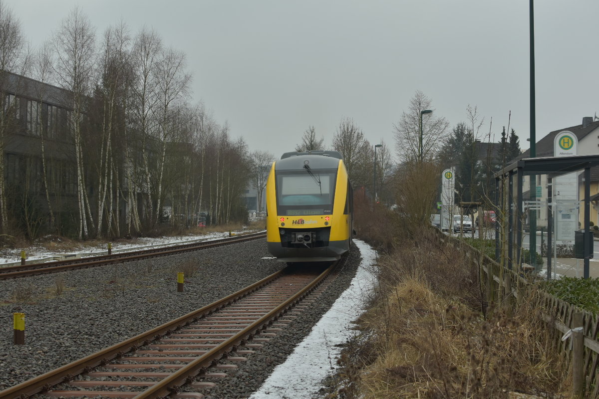 Im Bahnhof Attendorn fährt der HLB VT 257.1 gen Olpe aus, als RB92 am Samstag 11.2.2017