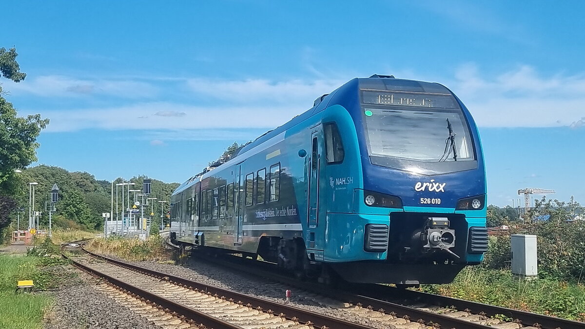 In Lauenburg (Elbe) eingefahrener Akkutriebzug Stadler 526 010 (94 80 2526 010-0 D-SRSDE) erixx wird nach wenigen Minuten zurück nach Lüneburg fahren; 25.08.2025 Volkmar Döring
