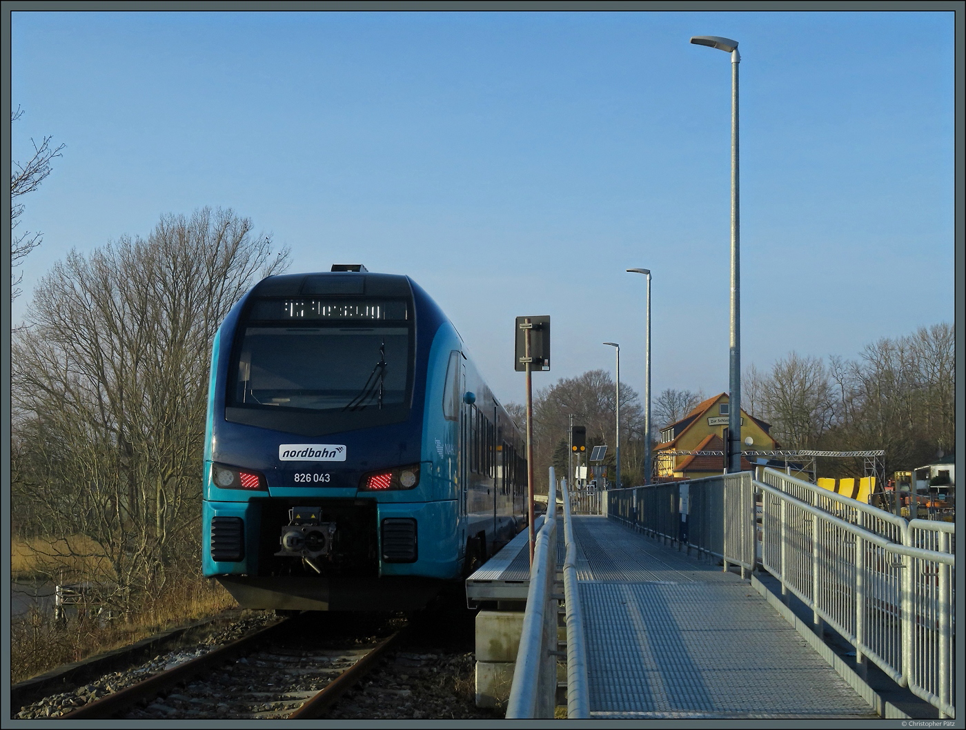 526 043 der Nordbahn steht am 21.02.2025 am provisorischen Haltepunkt Boren-Lindaunis Schleibrücke Nord zur Weiterfahrt nach Flensburg bereit. Christopher Pätz