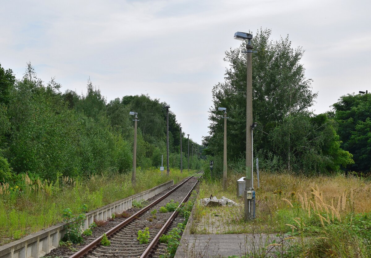 Blick über die traurigen Überreste des Bahnhofes Bad Schiedeberg in Richtung Eilenburg. 1998 wurden die durchgehenden Züge nach Eilenburg eingestellt seither endeten die Züge aus Richtung Pretzsch hier in Bad Schmiedeberg. Der letzte Ast von Wittenberg nach Bad Schmiedeberg Ende 2014 eingestellt. Zuletzt gab es hier 2017 Sonderzüge. Ende 2019 wurde die Strecke wegen Oberbaumängeln betrieblich gesperrt. Seitdem verwildern einige Teile der Strecke zusehens.