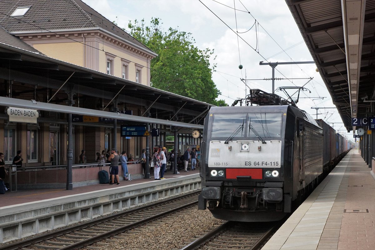 DB BAHNHOF BADEN-BADEN. Güterzugsdurchfahrt in Richtung Karlsruhe mit der MRCE 189-115, ES 64 F4-115 am 21. Juni 2018. Foto: Walter Ruetsch