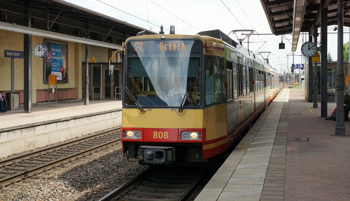 DB BAHNHOF BADEN-BADEN. Zugseinfahrt der S 7 vom 21. Juni 2018 nach Achern bestehend aus dem Triebzug 808 der Stadtbahn Karlsruhe. Foto: Walter Ruetsch