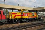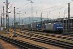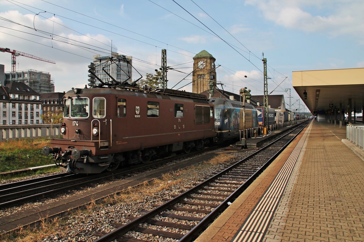 Durchfahrt am Nachmittag des 21.10.2015 von Re 4/4 174 (425 174-0) "Frutigen" zusammen mit Re 465 008-1 "GoldenPassLine" und einem KLV über Gleis 1 durch den Badischen Bahnhof von Basel gen Rangierbahnhof Muttenz.