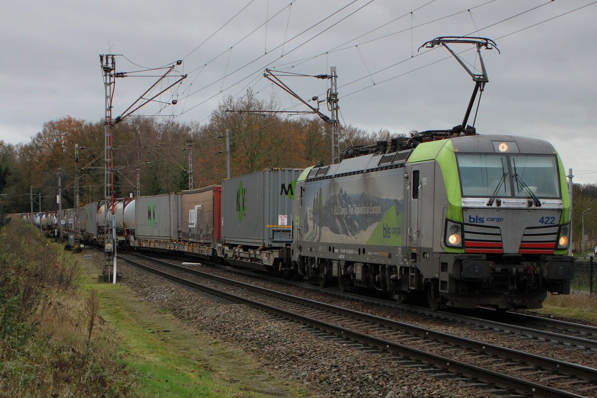 Am trüben 6.Dezember 2025 treft BLS 475 422 samt deren KLV in Venlo ein und wird vom offenbarer Stelle fotografiert.