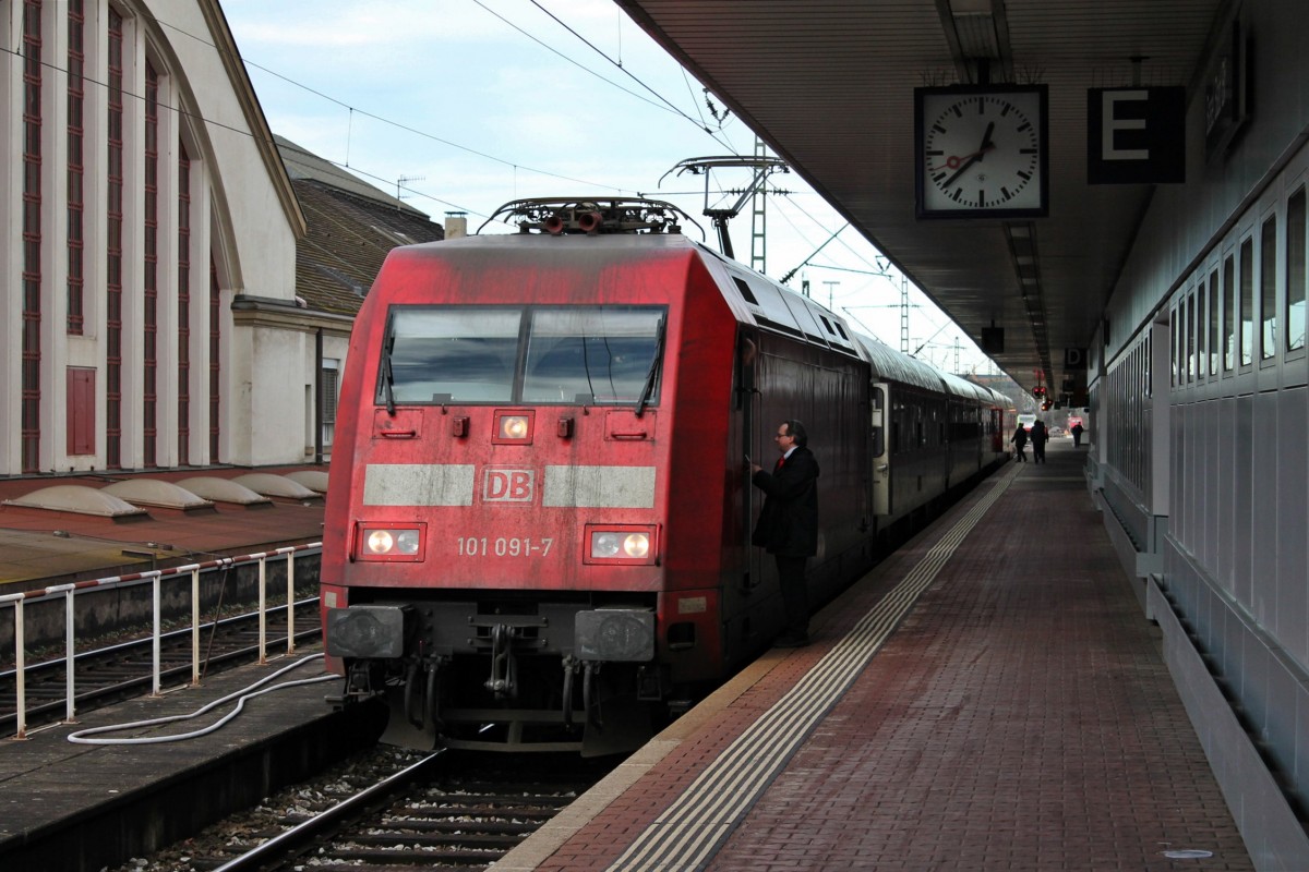 Ebenfalls am 17.01.2014, die Hamburger 101 091-7 mit dem +150 min. Verspäteten CNL 473 "Aurora" (Kopenhagen CS - Basel SBB) bei ihrem Aufenthalt in Basel Bad Bf kurz vor dem Ziel.