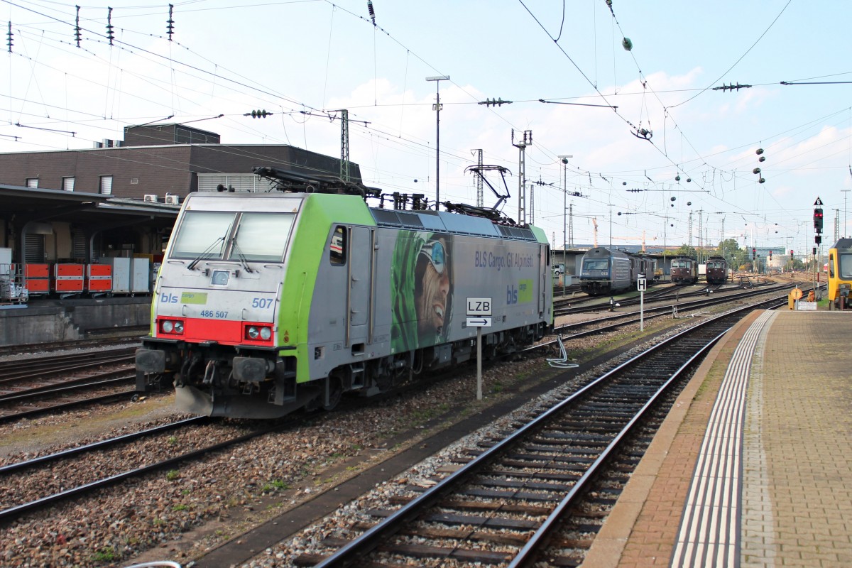 Nachschuss am 04.10.2014 auf Re 486 507, als sie durch den Badischen Bahnhof von Basel als Lokzug in Richtung Weil am Rhein fuhr.