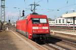 Stadt Basel (Schweiz) am Donnerstag den 12.04.2012 um 15:59 Uhr. Im DB Personenbahnhof  Basel Bad Bf  steht auf Gleis 10 die DB E-Lok 111. Sie trägt die UIC Nummer 91 80 6111 062-6. Zusätzlich ist sie mit einem aufgeklebten Wappen versehen. Es ist das Wappen von Neuenburg am Rhein. Es handelt sich hier um eine Regionalbahn nach Offenburg. Die Lok schiebt den Zug (siehe Beleuchtung). Betreffs Bahnhofstandort siehe Staatsvertrag vom 27. Juli 1852. Koordinaten GMS (Grad, Minuten, Sekunden): N 47° 34’ 3.7’’ O 7° 36’ 30.6’’