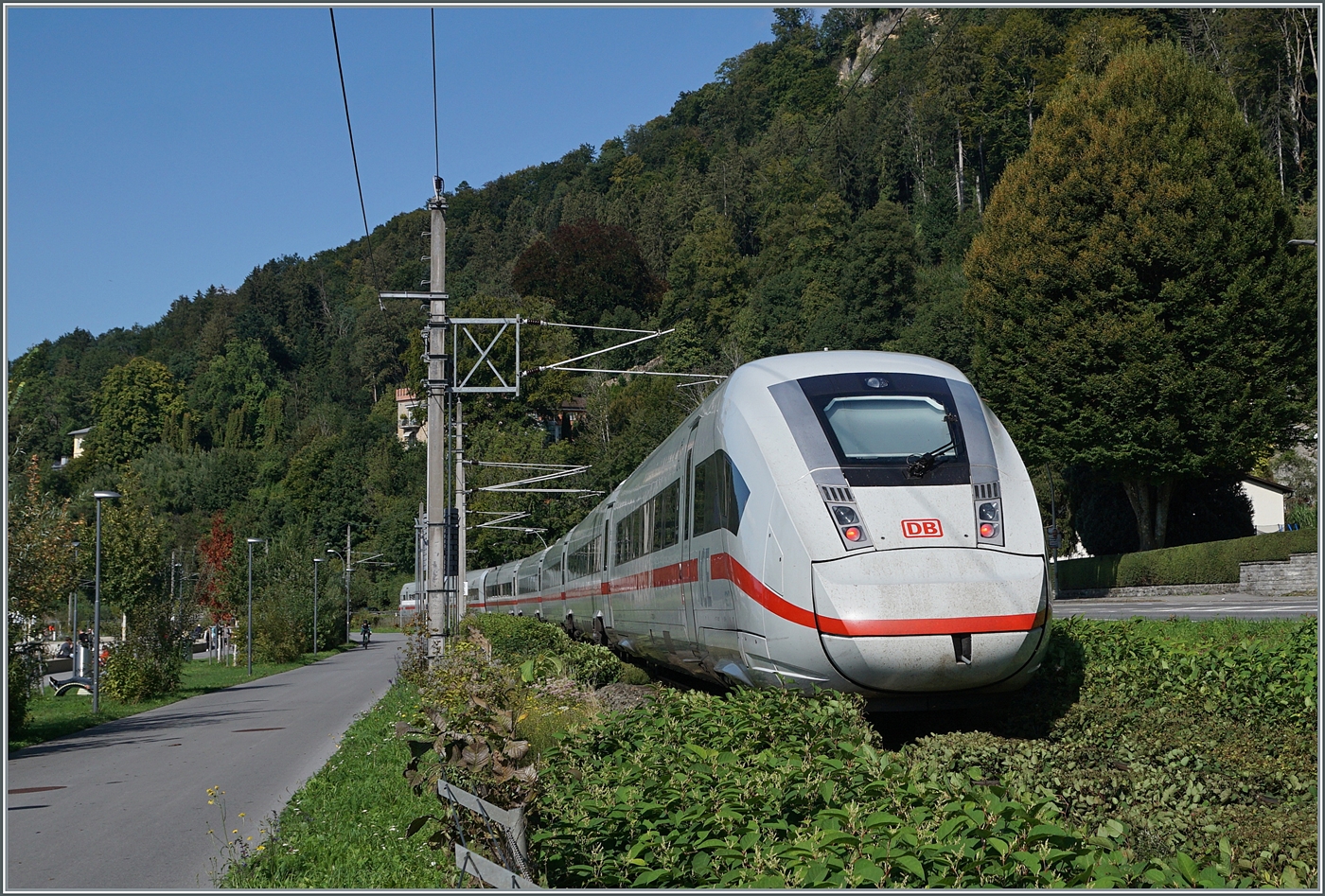 In der Gegenrichtung, auf der Fahrt in Richtung Lindau kämpft sich zwischen Bregenz und Lochau ein DB ICE 4 durch die üppige Vegetation.