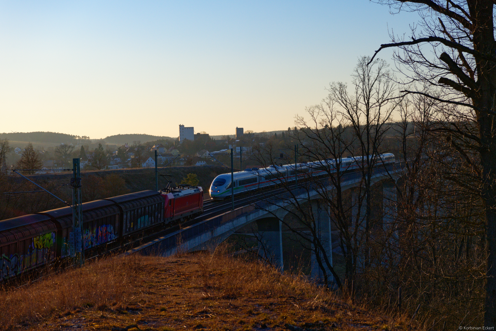 Zugbegnung zwischen einer DB Cargo 187 mit einem gemischten Güterzug und einem ICE 3 bei Emskirchen Richtung Nürnberg, 09.03.2022
