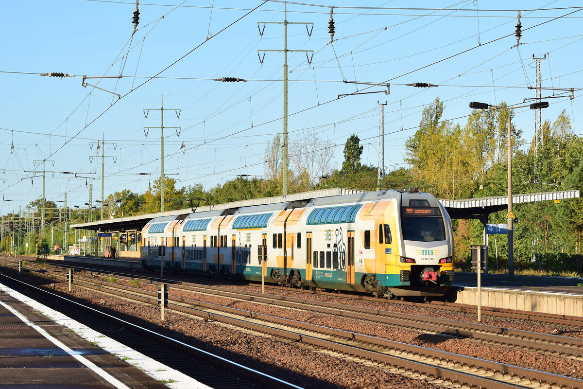 Hier 285 108-7 mit einem Schüttgutwagenzug, bei der Durchfahrt am 27.4.2013 durch Berlin Schönefeld Flughafen, in Richtung Berlin Grünauer Kreuz.