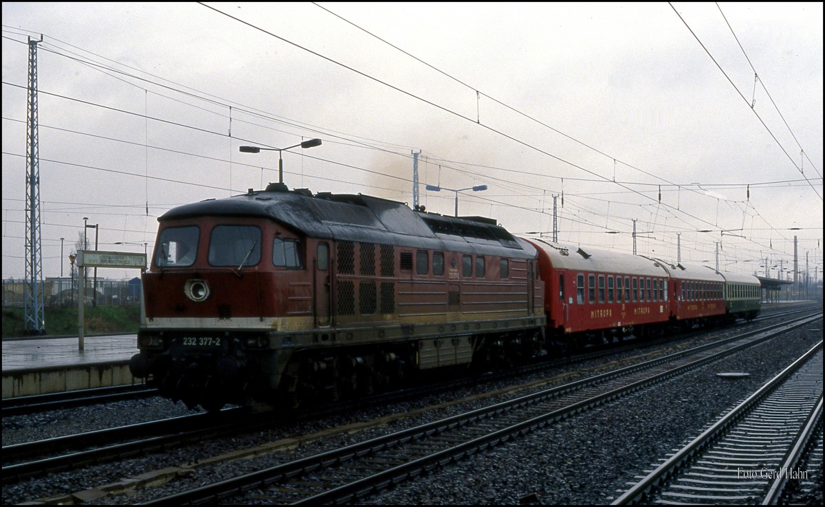 232377 hatte bei der Durchfahrt in Berlin Schönefeld am 16.4.1992 unter anderem zwei Mitropa Schlafwagen am Haken!